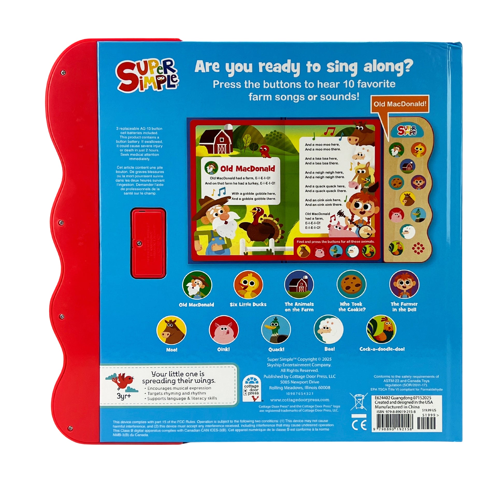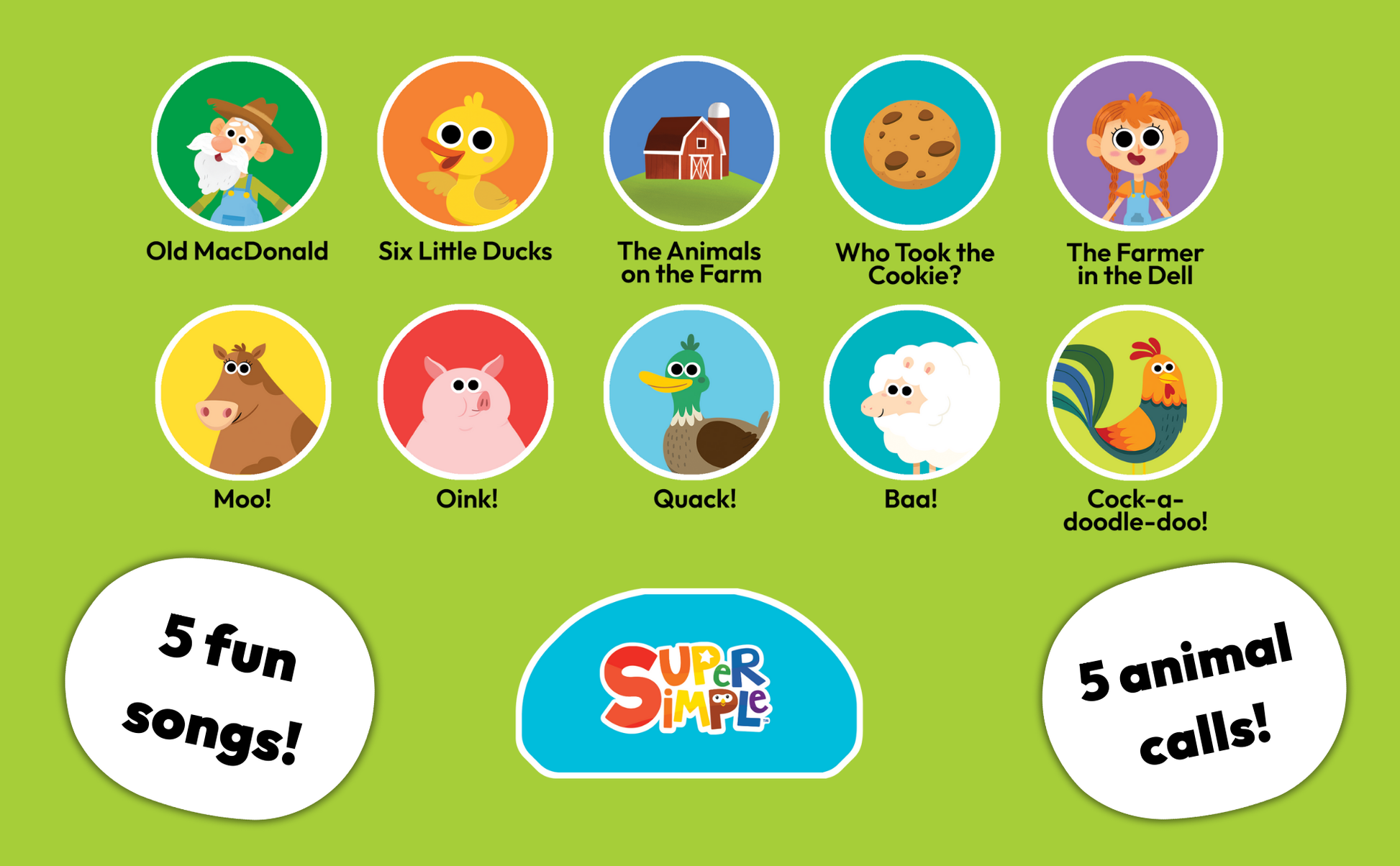Sing along to your favorite Super Simple™ farm tunes! Songs like Old MacDonald Had a Farm, The Animals on the Farm, Six Little Ducks, Who Took the Cookie, and The Farmer in the Dell will have toddlers and preschoolers dancing and singing. Then play along to answer fun farm questions and hear farm animal sounds. Learning is SIMPLE and fun with Super Simple Songs! Pressing the song and sound buttons and following along provides a fun sensory experience designed to entertain, strengthen fine motor skills, and encourage musical expression.